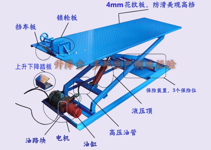 三、一定要把貨物(含手推車、叉車)放穩(wěn)或鎖定后方可升降,以防升降過程中出現(xiàn)滑動。