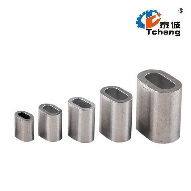 鋼絲繩鋁套—鋁套是鋁材質(zhì)的,較輕,用來(lái)固定鋼絲繩兩端的頭的,鋼絲繩根據(jù)需要的掛圈大小,插入鋁套,然后放入壓套機(jī)模具內(nèi),(根據(jù)鋁套型號(hào)對(duì)應(yīng)壓套機(jī)模具,模具型號(hào)跟鋁套型號(hào)都是標(biāo)準(zhǔn)尺寸),壓制完,把兩邊擠壓出來(lái)的鋁廢料清理掉,一根鋼絲繩完成!